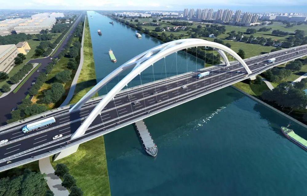 除了核心的道路建設,主要建設內容還包含紅線范圍內道路、橋梁、排水、交安、照明、環保、綠化及相關附屬設施等。其中,新建的上跨京杭大運河大橋為項目核心部分,總長度約742m,主跨采用跨徑200m提籃拱橋設計,既保證通行功能,又具備一定景觀價值。工程計劃總投資約4.09億元,建設工期約30個月。